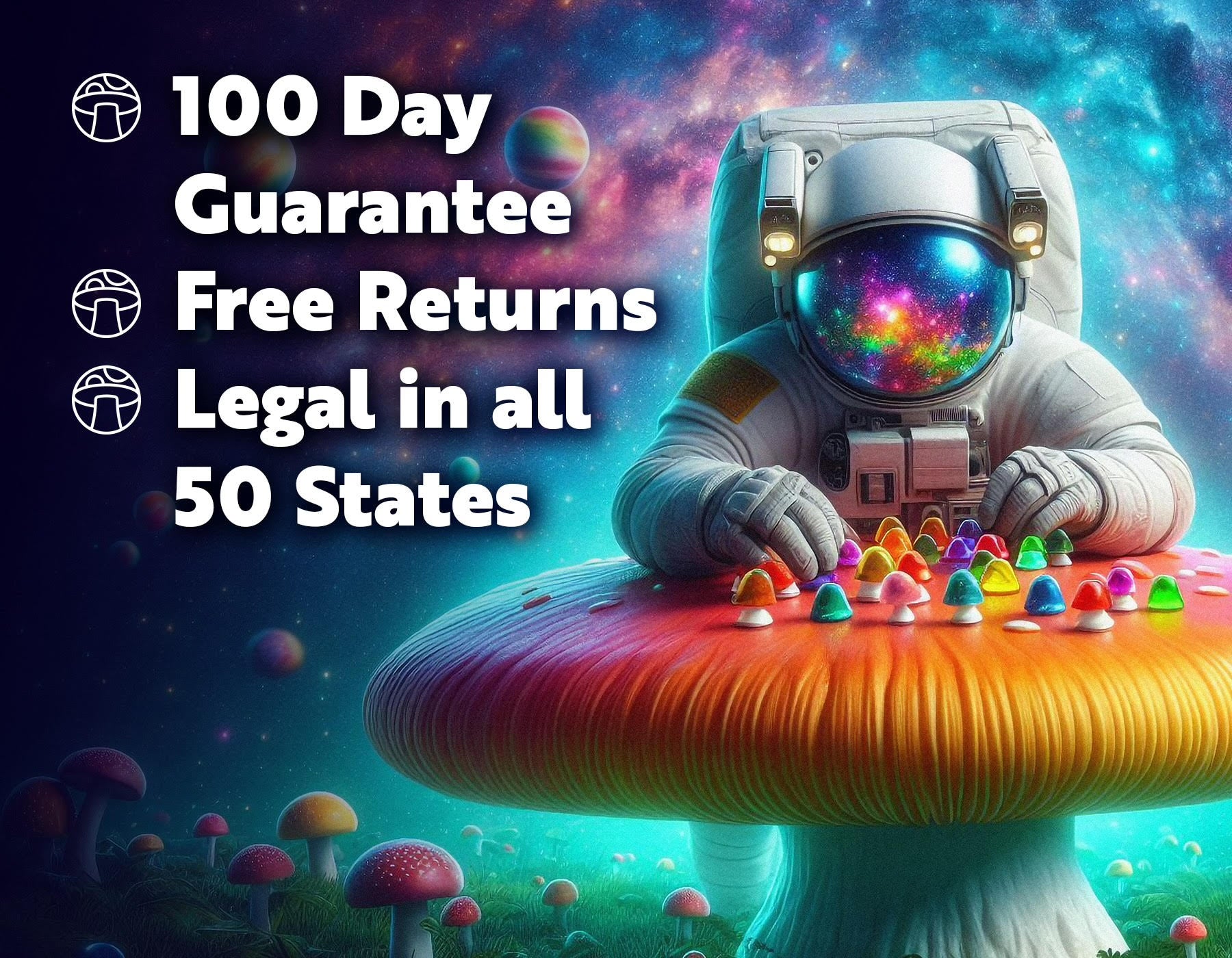 Our Mushroom products are produced in the USA, 100% Vegan & contain high quality ethically sourced materials made by fair-wage employees. We take pride in the production of these products that not only help provide people with fun new experiences, but also to those who truly can benefit from their potentially therapeutic use.
